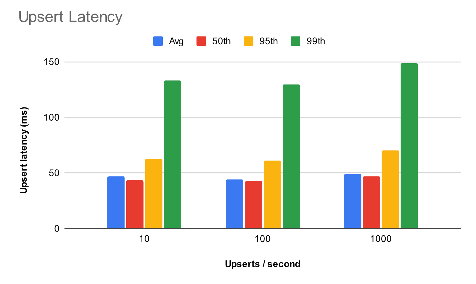 To demonstrate LambdaDB’s performance and scalability, we added one million 960-dimensional vectors to a collection with varying concurrency levels. With 10 upserts per second, the median latency is just 43 ms with a very short tail (133 ms at the 99th percentile). Write scalability is particularly impressive, as the latency remains similar even when traffic increases 100-fold.