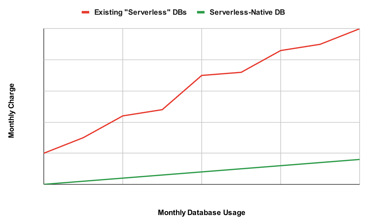Monthly charges as database usage grows: ideal vs. reality.