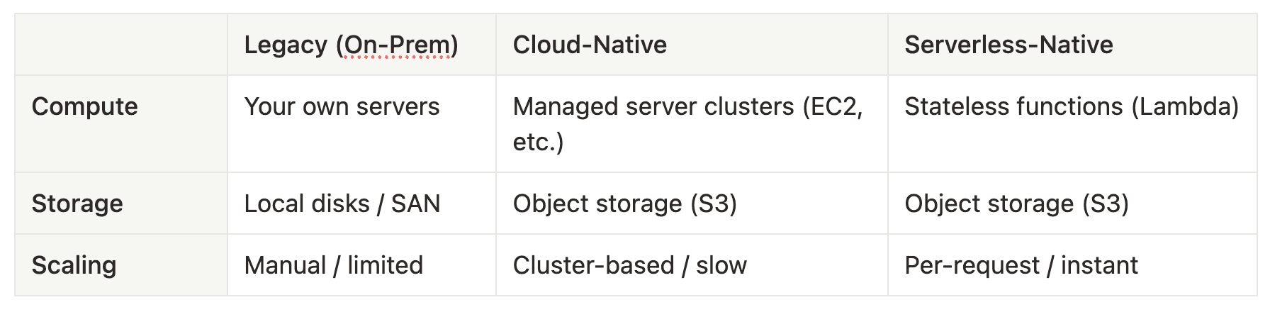 But here’s the hidden truth: look under the hood, and you’ll find they aren’t truly serverless. Most of these services are built on a cloud-native architecture, a brilliant but decade-old design that separates compute clusters from cloud storage. This model, pioneered by Snowflake [1], was a revolution for the serverful era. But it was never designed for modern serverless components like AWS Lambda.